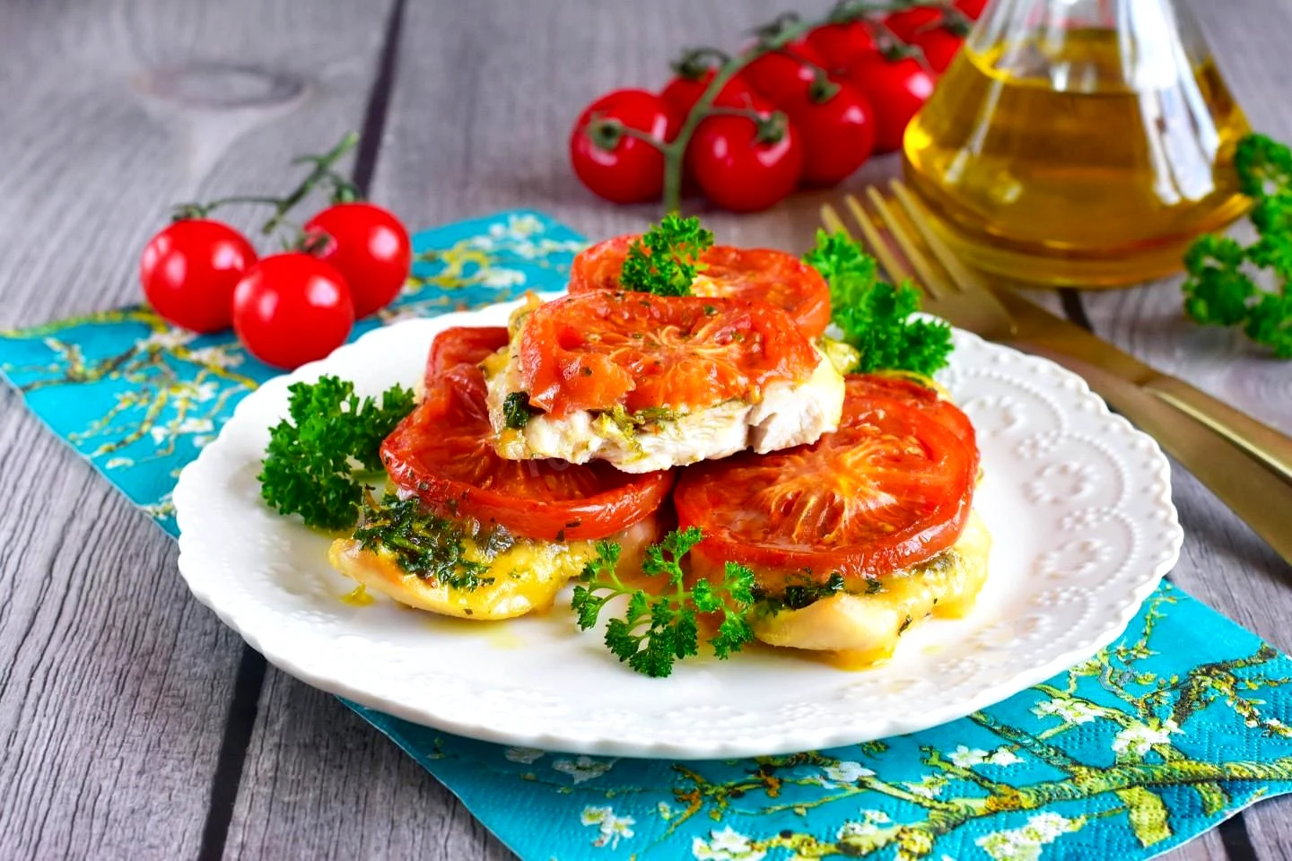 Куриная отбивная с помидором и сыром в духовке