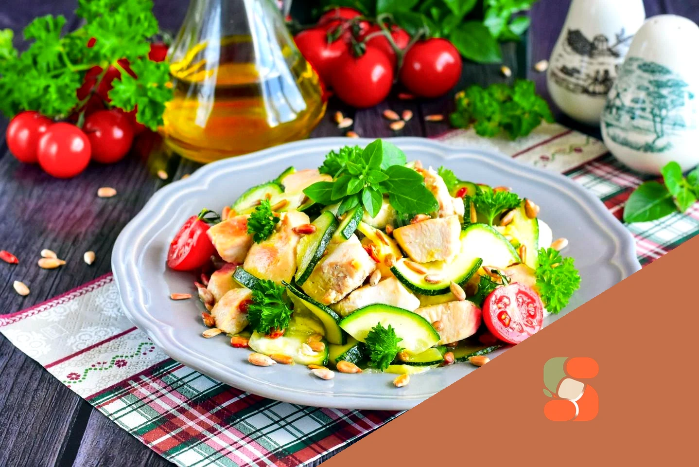 : Додайте в сковороду до курки кабачок Смажте, періодично помішуючи, 5 хвилин. За цей час кабачок не повинен втратити форму та розваритися.