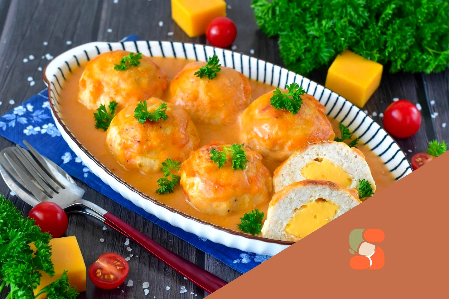 : Залийте котлети з сиру начинкою томатним соусом і поверніть в духовку ще на 30-35 хвилин. Час вказано приблизно і буде залежати від вашої духовки. Дізнатися про особливості роботи духовок можна, прочитавши окрему статтю, посилання наприкінці рецепту.