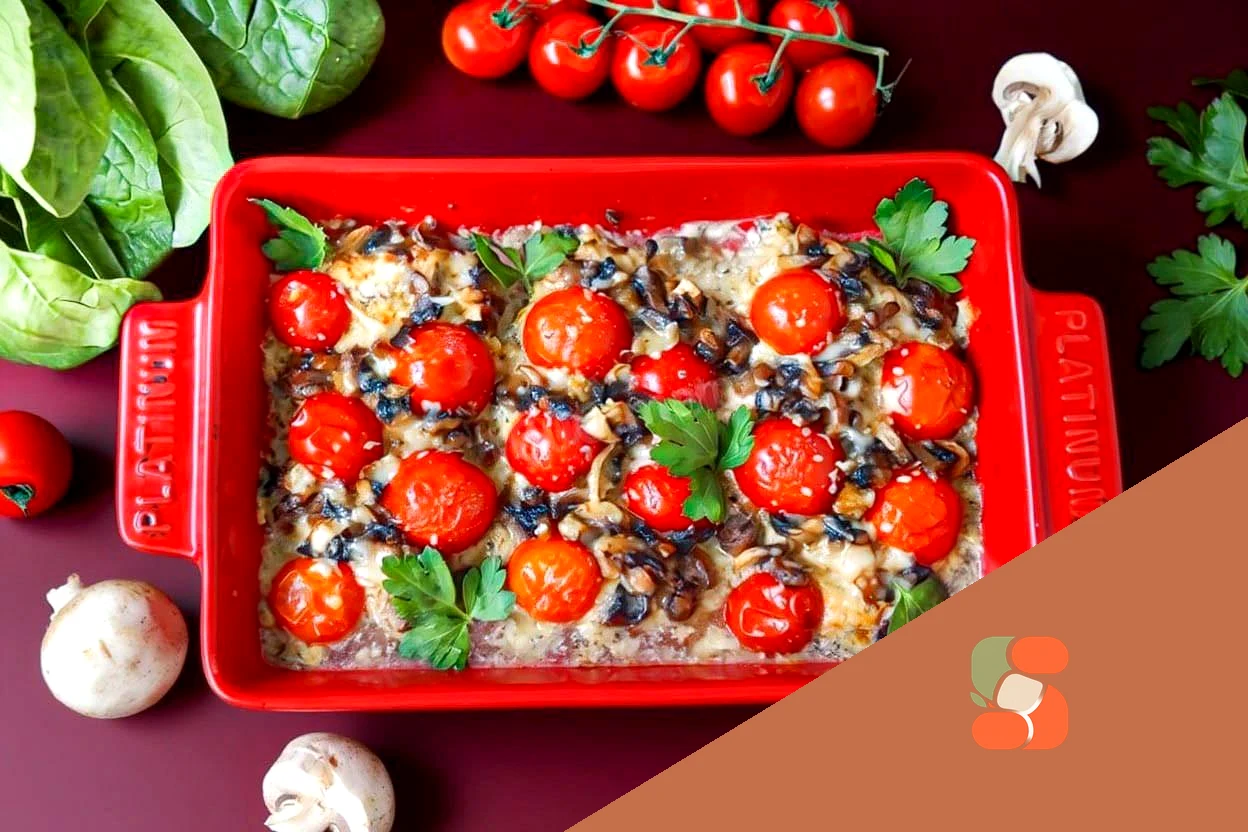 Як додати помідори та почати запікання? Візьміть чері або інші помідори, сполосніть і розріжте навпіл чи четвертинки. Розкладіть помідори і гриби, що залишилися поверх відбивних. Поставте форму в розігріту до 180 градусів духовку та запікайте приблизно 15–20 хвилин. Температура та час приготування можуть відрізнятися від зазначених у рецепті. Скористайтеся корисною інформацією про особливості духовок!