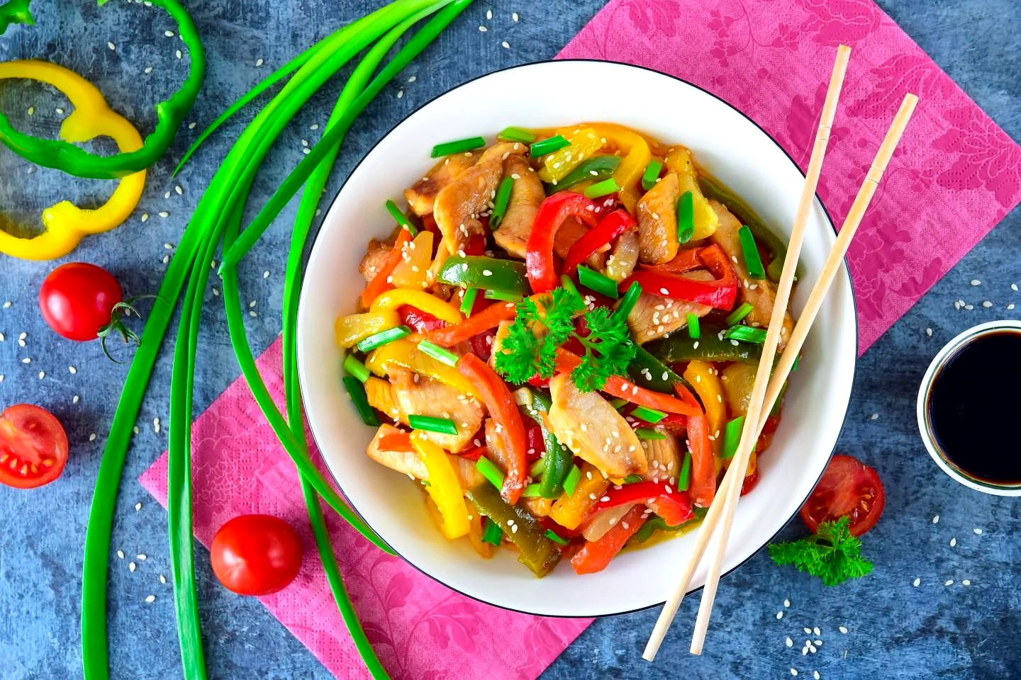 Курица с овощами в соусе кисло сладком на сковороде