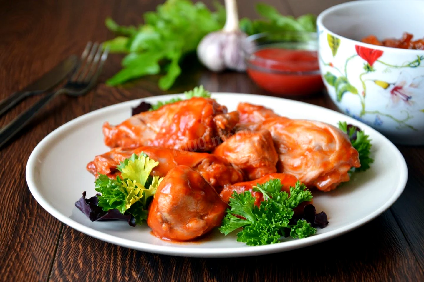 : Добавьте в кастрюлю кетчуп и тушите содержимое на медленном огне под крышкой около 20 минут изредка переворачивая курицу. Кетчуп можно заменить томатным соусом, который следует сначала разбавить в чашке кипяченой прохладной водой.