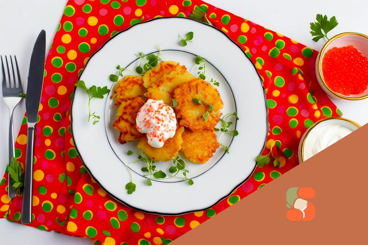 : Готові картопляні латкеси подавайте гарячими, просто викладіть їх на блюдо і полийте сметано-ікорним соусом. Це традиційна страва на єврейську Хануку, але їх можна їсти і в будь-які інші дні)
