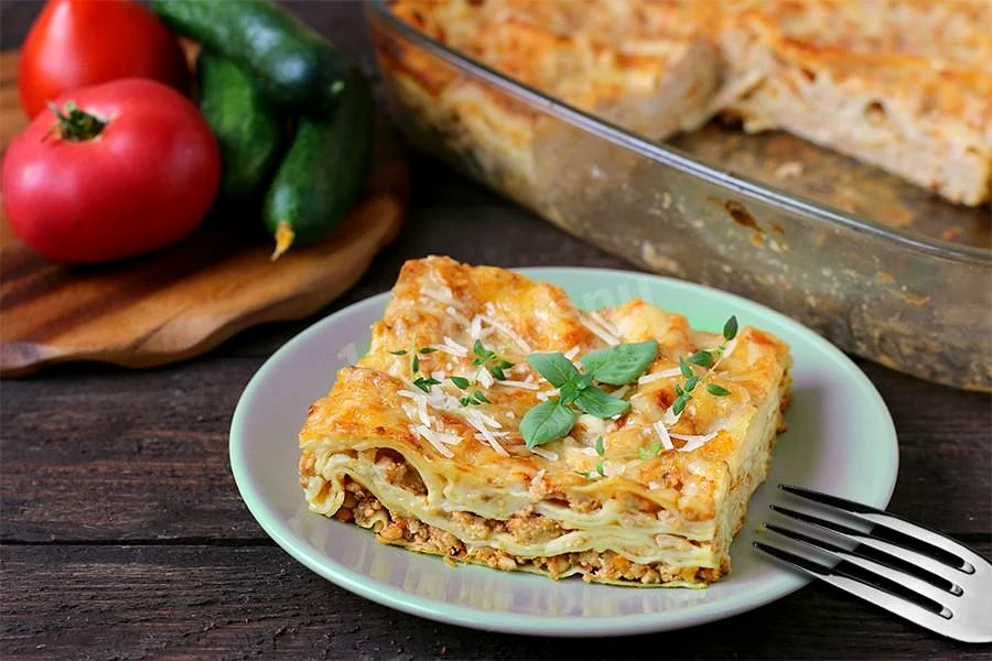 Інгредієнти−7 порцій+Продукти (7 порцій)Листи лазаньї720 грПармезан20 грЗелень20 грЦибуля ріпчаста80 грМорква80 грРослинна олія30 млВершкове масло|мастило|40 грКурячий фарш600 грТоматний соус200 грКурячий бульйон250 млПармезан70 грВершкове масло|мастило|80 грМолоко700 млПшеничне борошно40 гр