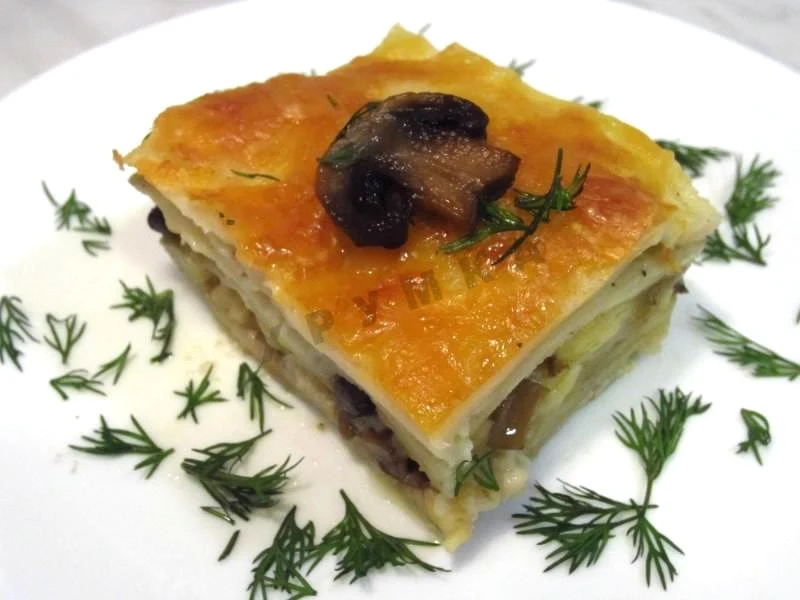: Розкачати тісто в пласт і вирізати листи необхідної форми та діаметру.Формуємо лазанню. Дно змастити олією, викласти перший лист, зверху гриби, трохи сиру та соус і викласти знову лист. Таким чином, збираємо лазанню.