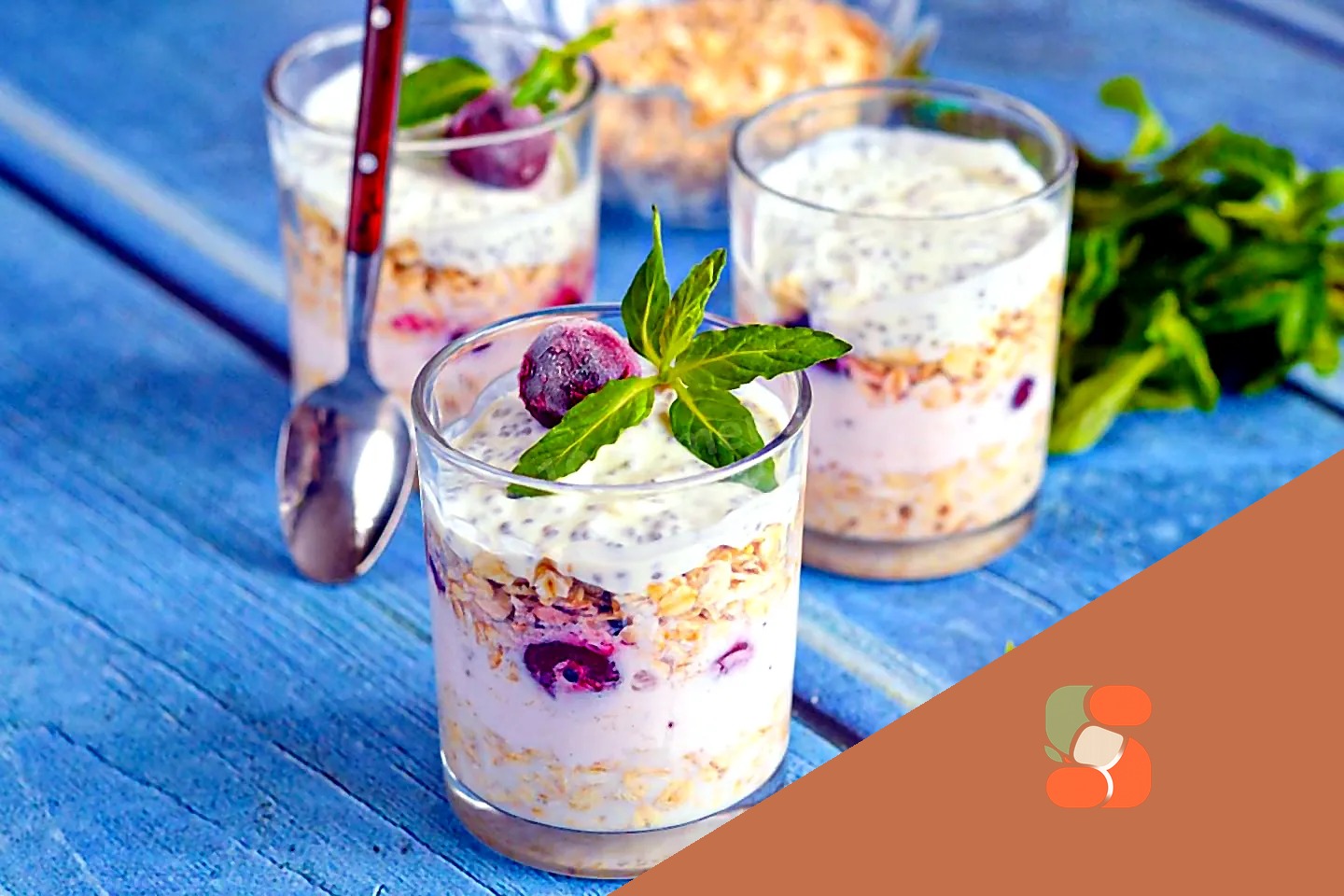 Як зібрати ліниву вівсянку на ніч? По чистих баночках або склянках рівномірно розподіліть половину вівсяних пластівців. Залийте пластівці молоком. На вівсянку з молоком викладіть вишневий йогурт. Зверху розподіліть ягоди вишні. На вишню висипте вівсяні пластівці, що залишилися, а зверху викладіть йогурт з насінням чиа. Щільно закрутіть баночки із вівсянкою кришками. За бажання можна струсити баночки, щоб вміст перемішався.