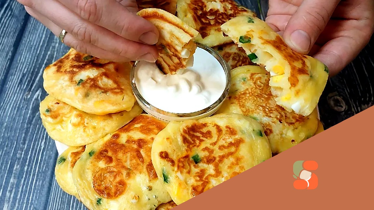 Ледачі оладки на кефірі на сковороді з цибулею та яйцем