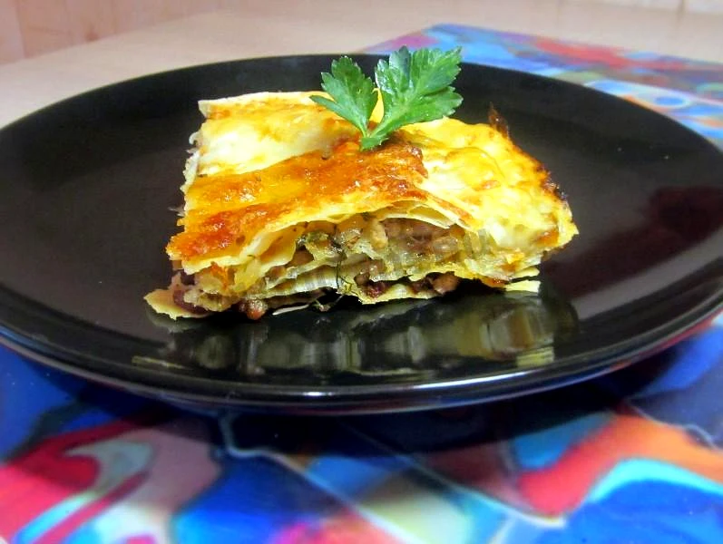 : Ще раз чергуємо шари в тому ж порядку Кількість шарів залежить від розміру форми – у вас може вийде їх більше чи менше, нічого страшного, головне рівномірно розподілити начинку. : Останній шар накриваємо лавашем, змащуємо соусом, посипаємо сиром. Ось і все – на підготовку пішло не більше 20-30 хвилин, решту зробить духовка. Відправляємо у розігріту до 180 градусів духовку на 30-40 хвилин до зарум'янювання