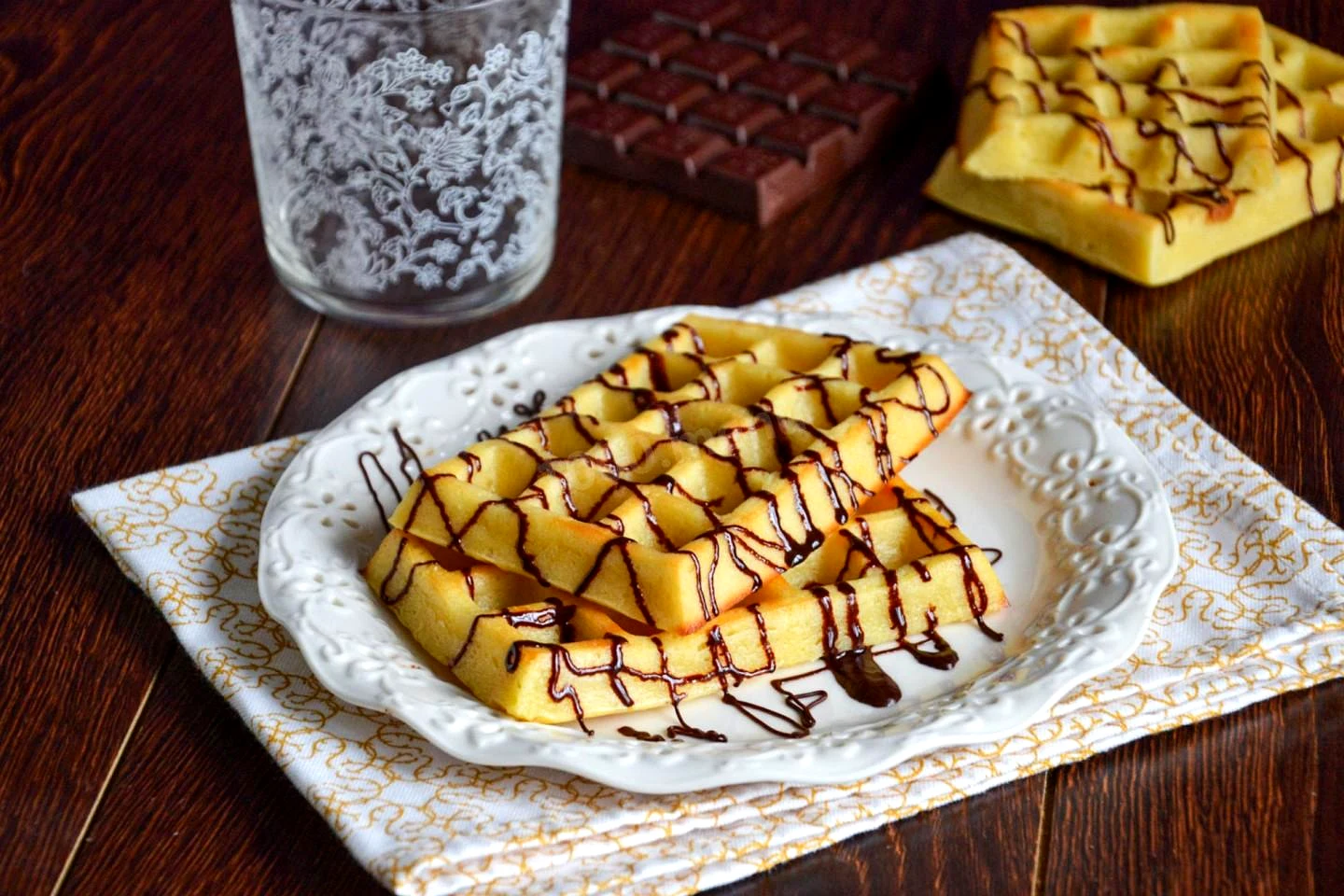 : Подавайте вафлі з варенням, сметаною, згущеним молоком, солодким кремом, шоколадною пастою, сиропом. Я просто розтопила трохи шоколаду і полила вафлі з кондитерського мішка. Приємного апетиту!