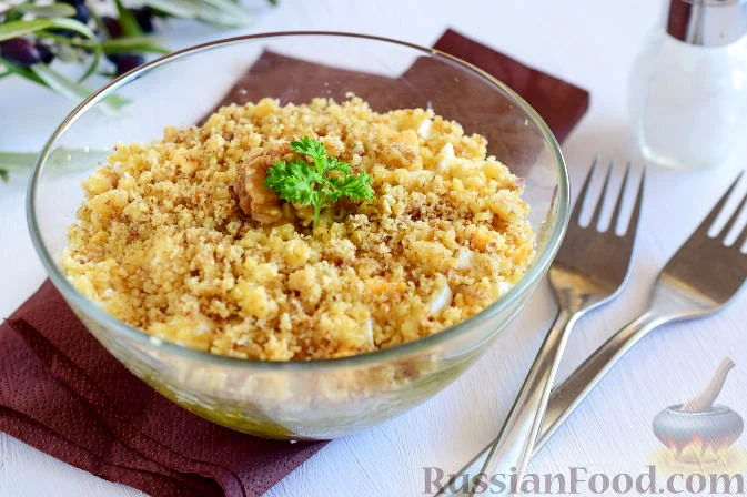 Посипаємо м'ясний салат товченими горіхами.