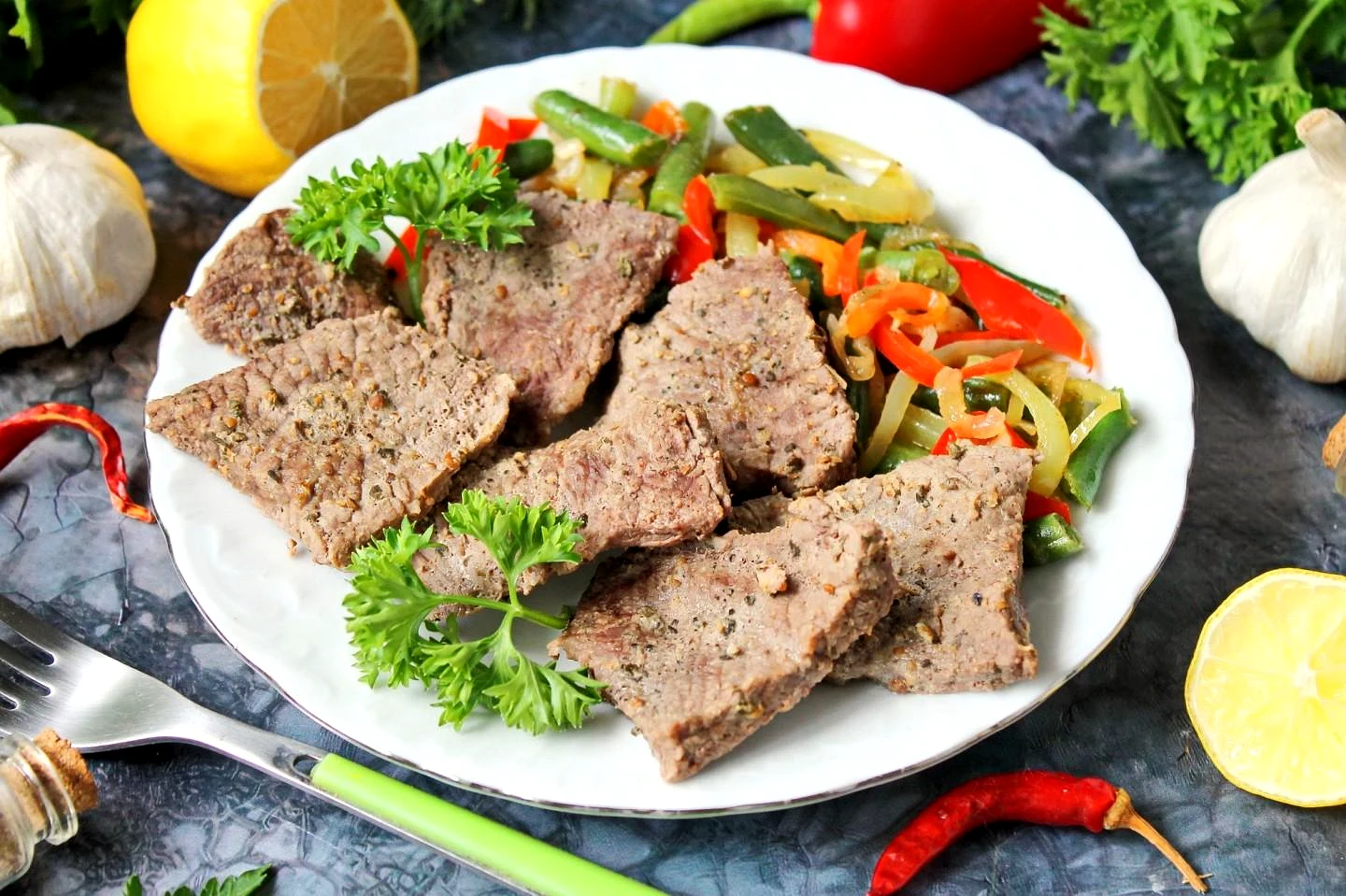 : М'ясо яловичини поріжте на плоскі шматочки поперек волокон або навскіс під кутом 30-45 градусів. Змішайте сіль, чорний перець, часниковий порошок, коріандр та базилік. Натріть масою шматки яловичини з усіх боків.