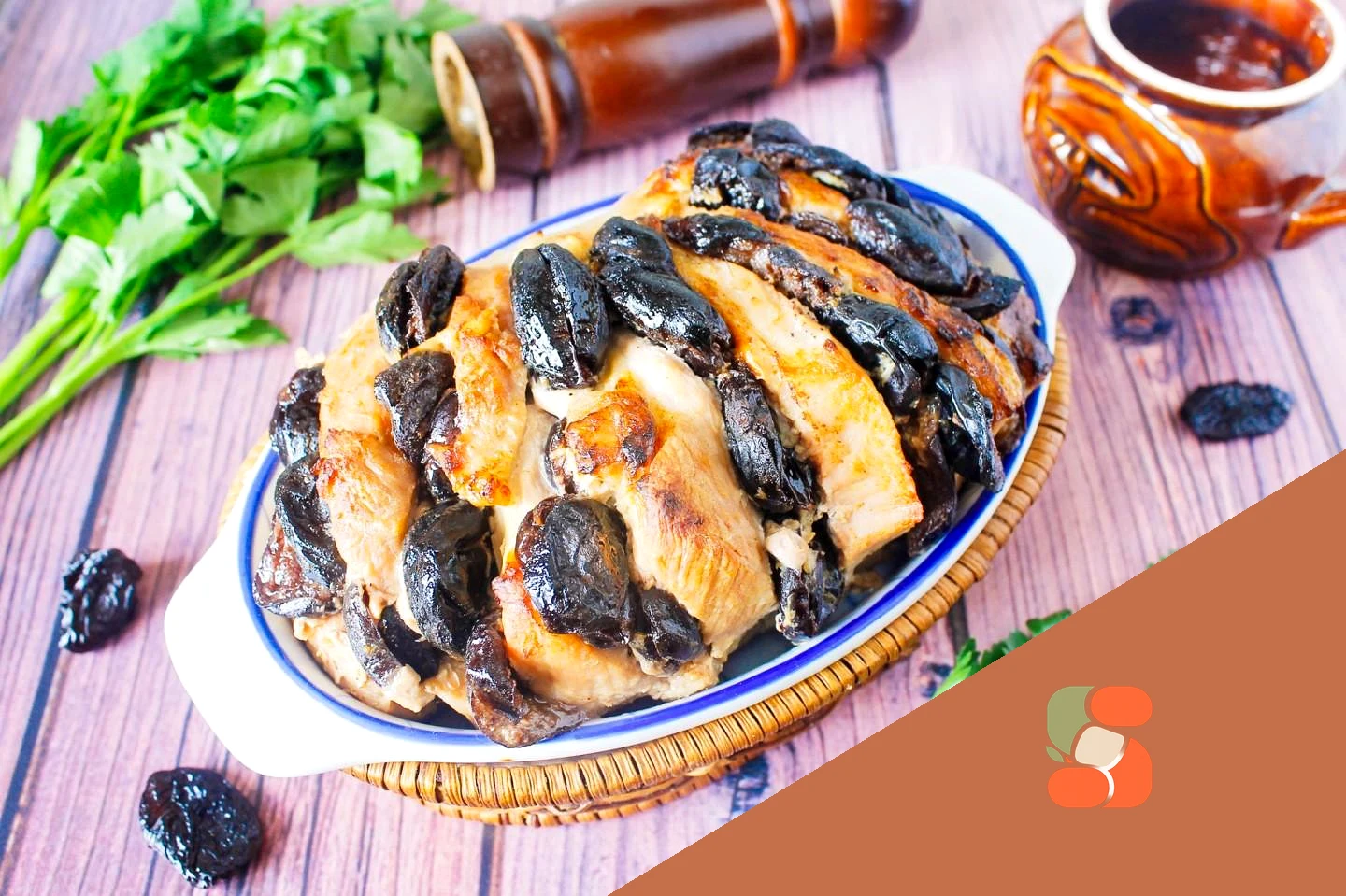 : У розрізи вставляємо чорнослив - по кілька штук У мене пішли усі 100 грам. Загорніть м'ясо в харчову плівку і залиште в холодильнику на 2 години маринуватися - взагалі чим довше, тим краще хоч всю ніч. Після маринування можна приступати до запікання. Увімкніть духовку на розігрів до 200 градусів.
