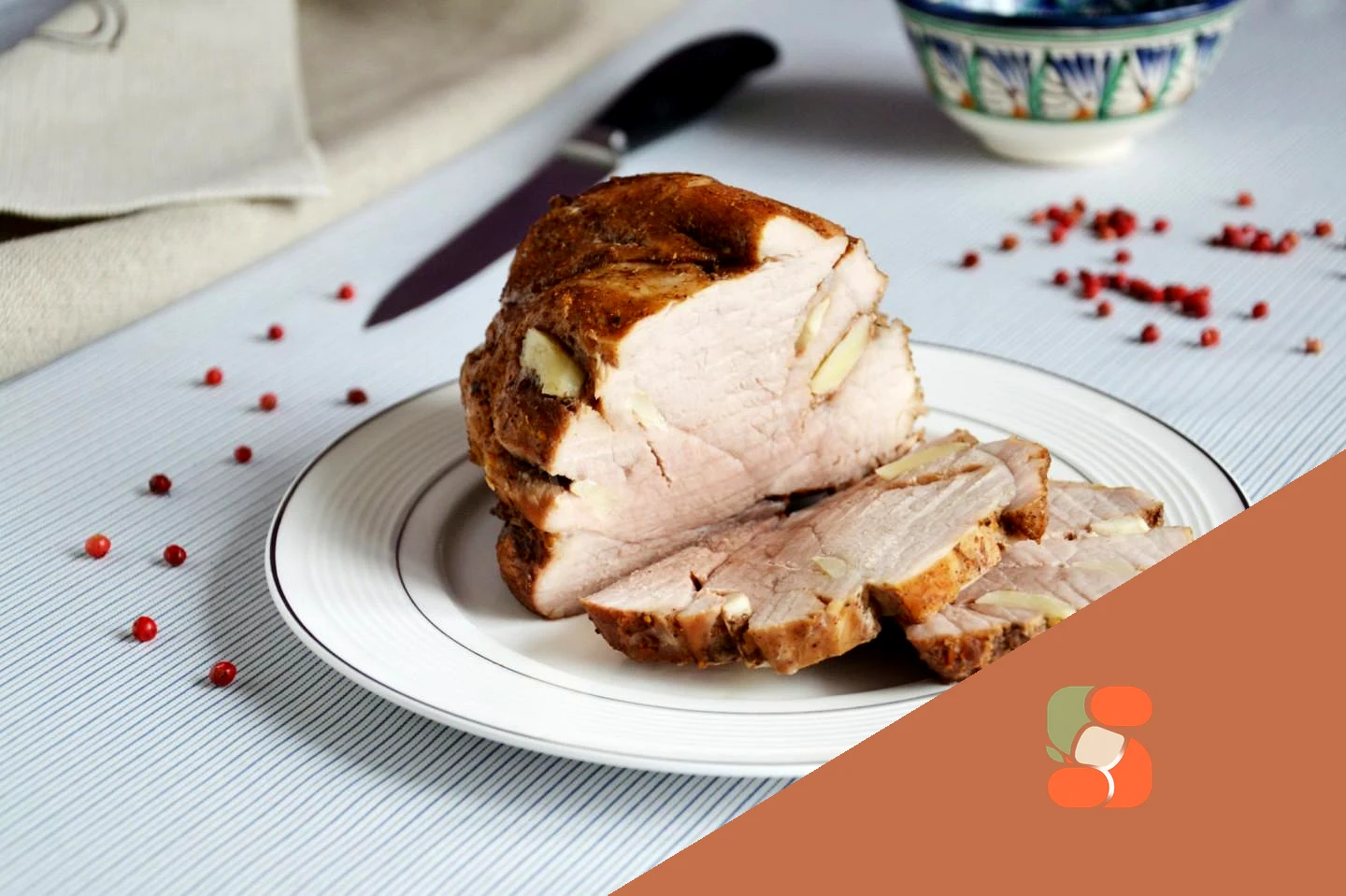 : У шматку м'яса зробіть ножем глибокі проколи Нашпигуйте свинину пелюстками часнику.