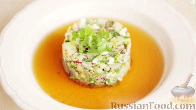 Для гарної подачі страви сервірувати окрошку можна за допомогою гарнірного кільця.