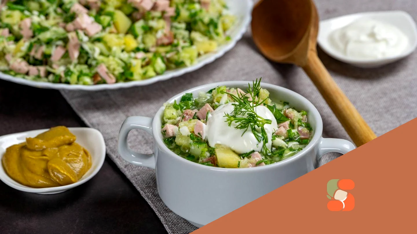 : Викладайте необхідну кількість приготовленої основи для окрошки в порційну тарілку, після чого додавайте до неї до смаку готову гірчицю, сіль та сметану.