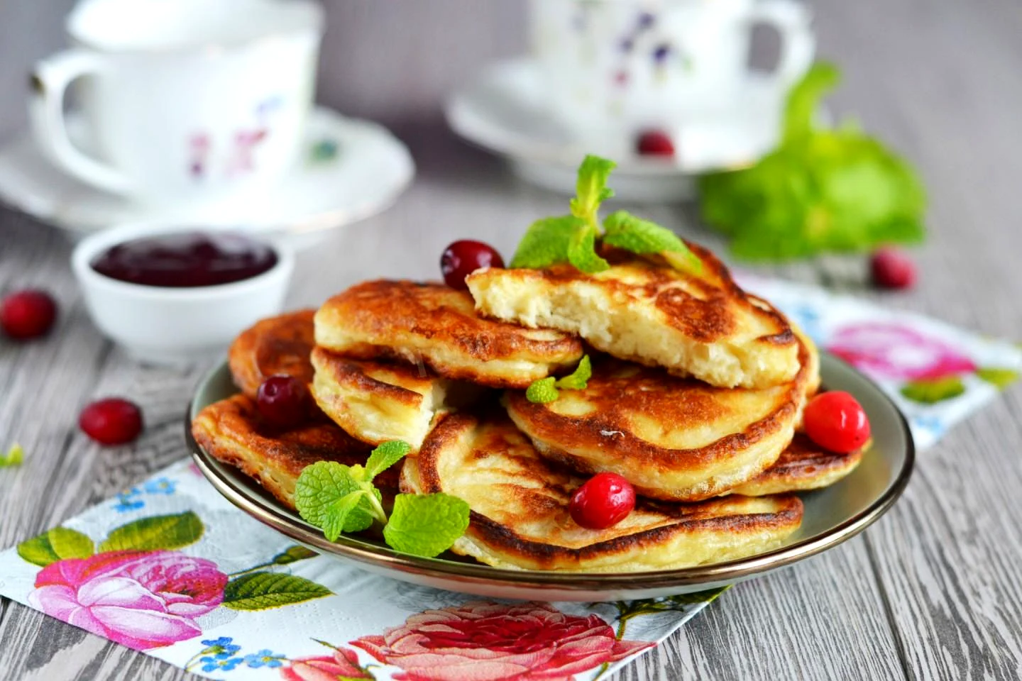 : Готовые пышные оладьи на простокваше переложите на тарелку и подайте к столу горячими. Приятного аппетита!
