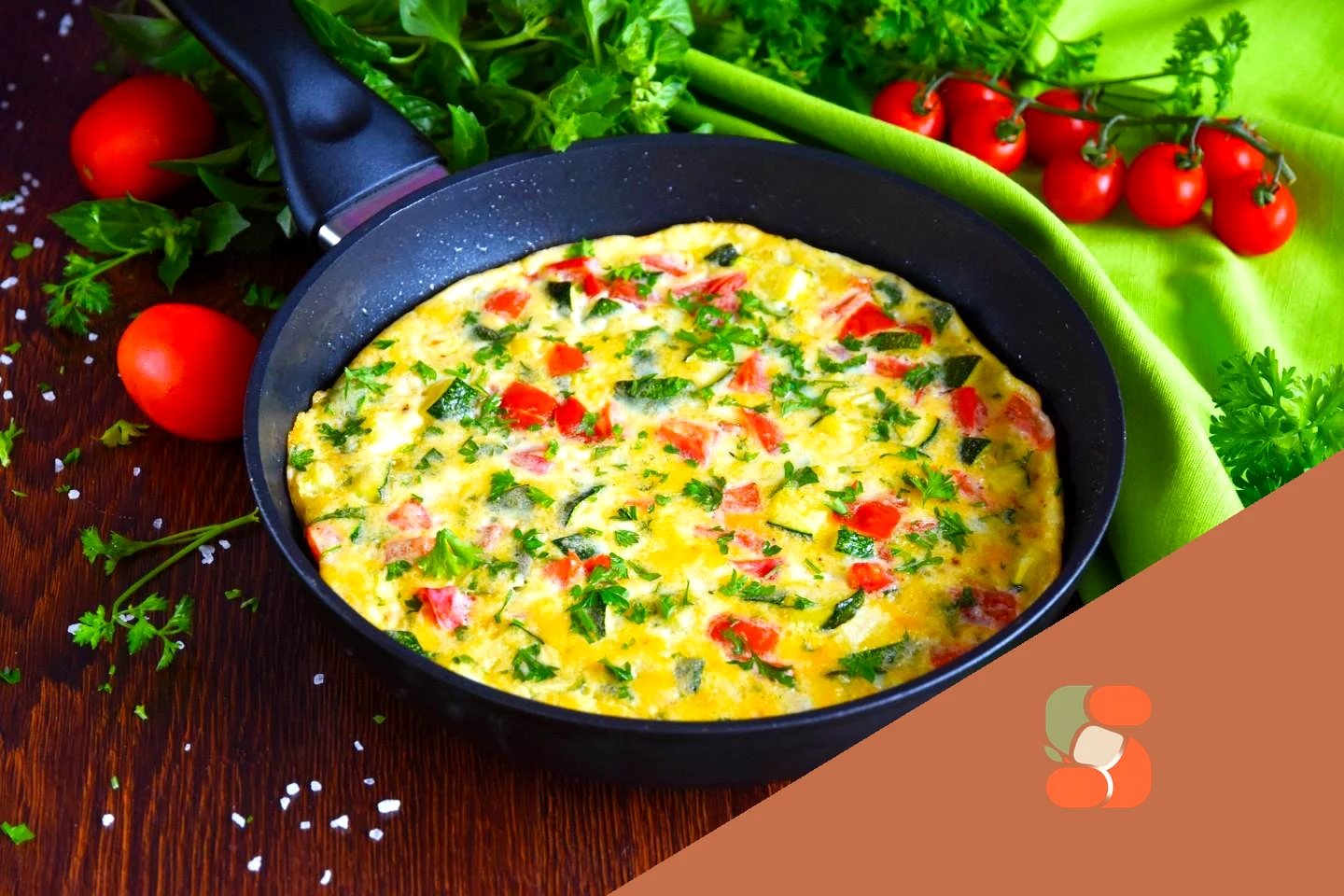 : У сковороді розігрійте рослинне масло, що залишилося. Вилийте в сковороду омлетно-овочеву суміш. Зверху ще трохи присипте подрібненою зеленню.