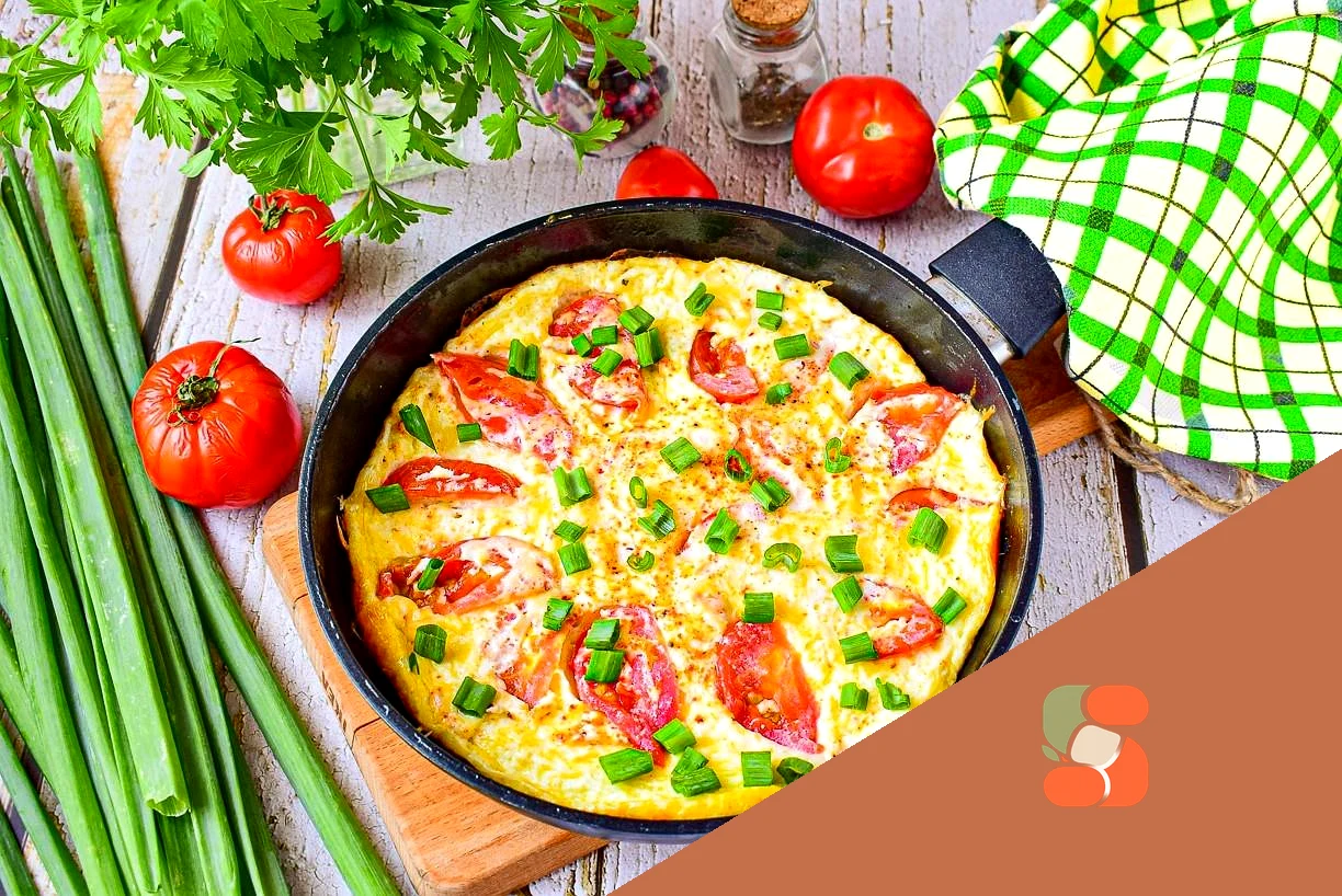 : По всій поверхні омлету викладіть нарізані помідори Чим більше помідорів, тим соковитішим буде готовий омлет.