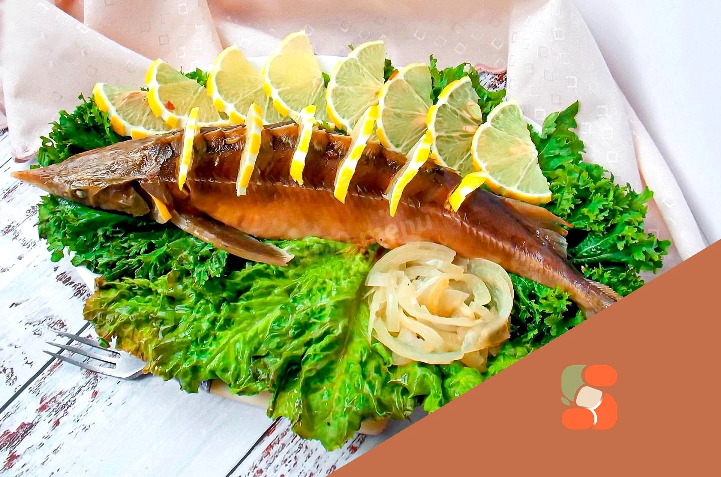: Выньте осетрину из духовки и дайте постоять 5-10 минут. Затем осторожно освободите рыбу от фольги. Открывайте ее аккуратно, чтобы не обжечься горячим паром. Украсьте тарелку листьями салата, оставшимися дольками лимона и лука. Перенесите осетра на тарелку. Подавайте его в горячем или холодном виде.