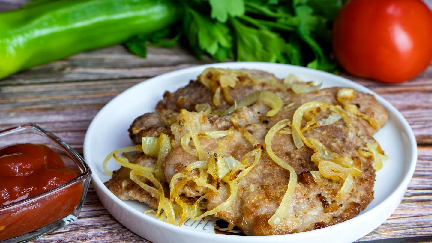 Отбивные из шеи свинины с репчатым луком на сковороде