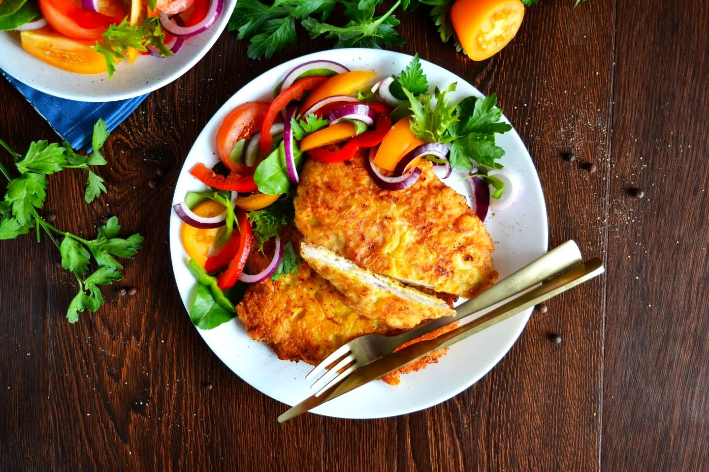 : К этим отбивным подойдет гарнир из нарезанных свежих помидоров, болгарского перца, красного лука и смеси салатных листьев, смешанных с парой столовых ложек оливкового масла.