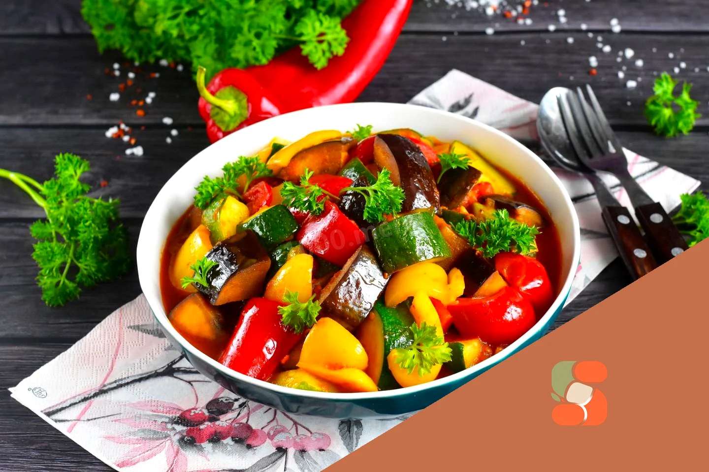 : Викладіть у соус обсмажені раніше овочі та акуратно перемішайте. Гасіть все разом при слабкому кипінні 10-15 хвилин або довше до готовності овочів. Найдовше доходять до готовності баклажани. При цьому овочі повинні зберегти форму.