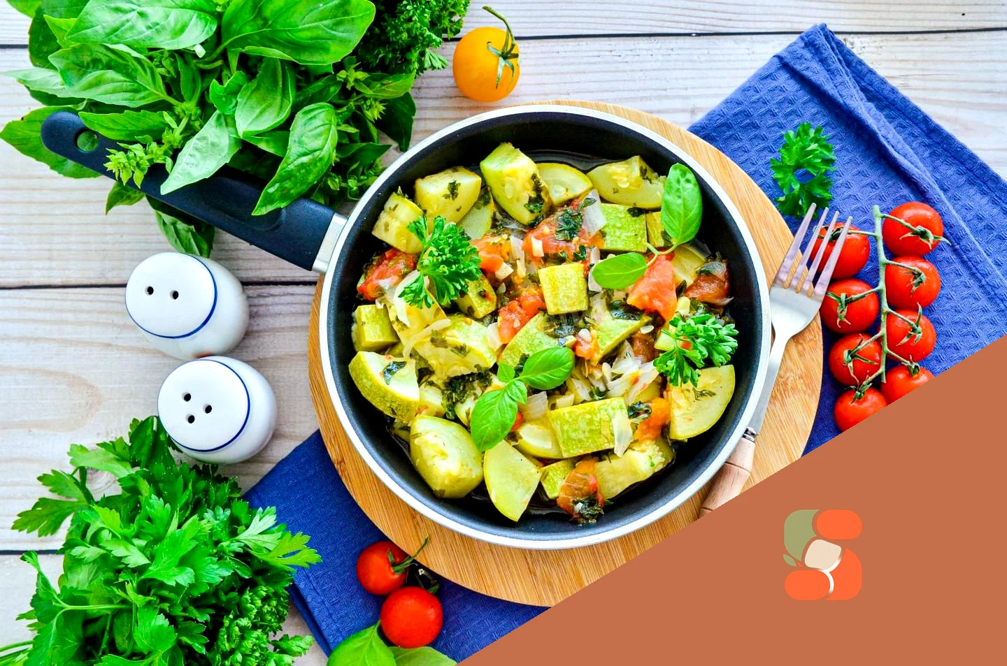 : Як зробити овочеве рагу з кабачками та помідорами? Підготуйте продукти. Кабачок візьміть середнього розміру, підійдуть як молоді плоди, так і зріліші. Помідори також середнього розміру або один великий. Окрім цього набору овочів та зелені ви можете додати й інші за смаком моркву, перець, баклажан. Овочі добре помийте та обсушіть.