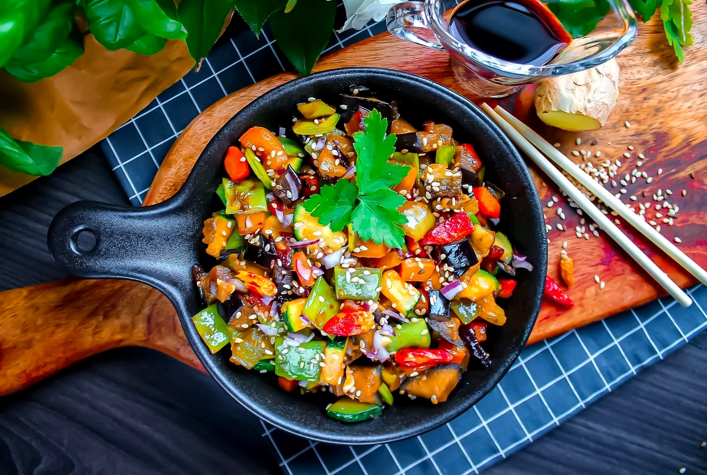 : Как пожарить овощи в соевом соусе на сковороде? Подготовьте всё необходимое по списку. Вместо стручковой фасоли можно использовать стручки молодого горошка. Хорошо подойдут к общему составу овощей черешковый сельдерей. Вместо обычного лука возьмите лук порей, если такой имеется в наличии, у него более мягкий и нежный вкус.