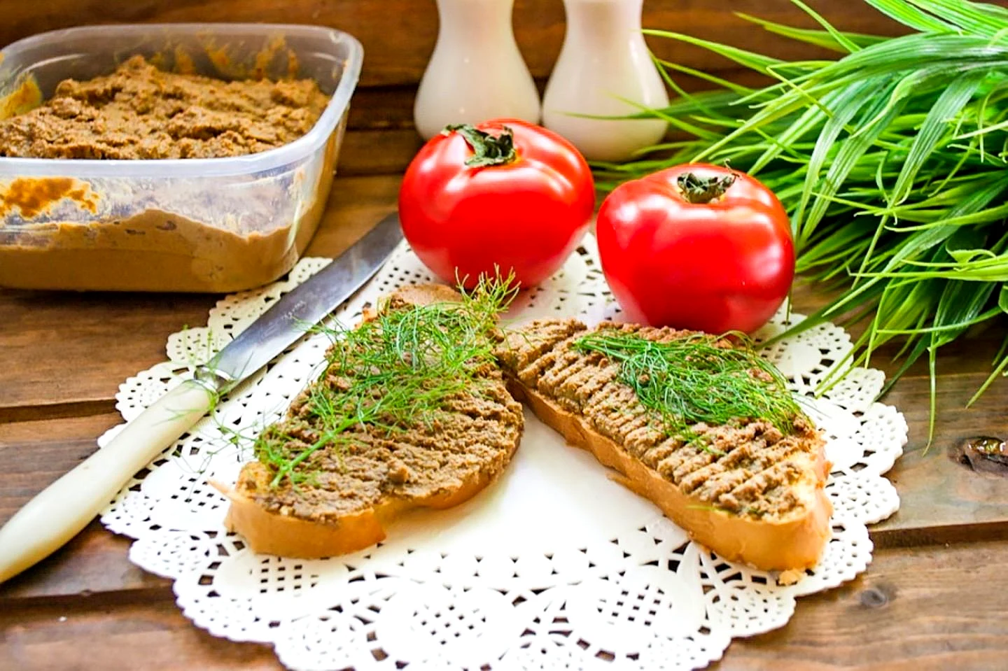 : Намажте паштетом білий або чорний хліб, батон. Прикрасьте бутерброди свіжою зеленню та подавайте на стіл. Приємного апетиту!
