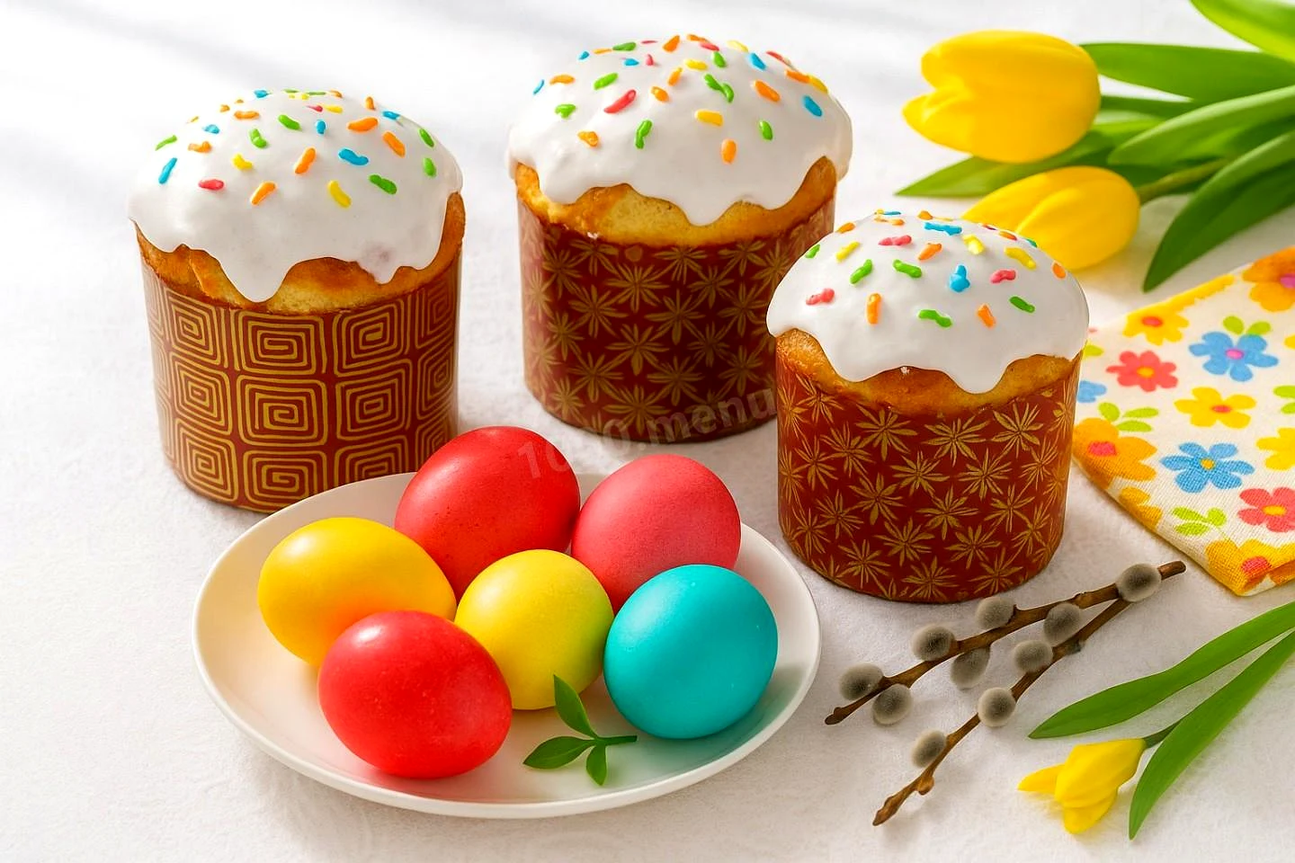 : Украсьте остывшие куличи глазурью. Если хотите украсить куличи посыпкой, то сразу это сделайте, пока глазурь не подсохла.