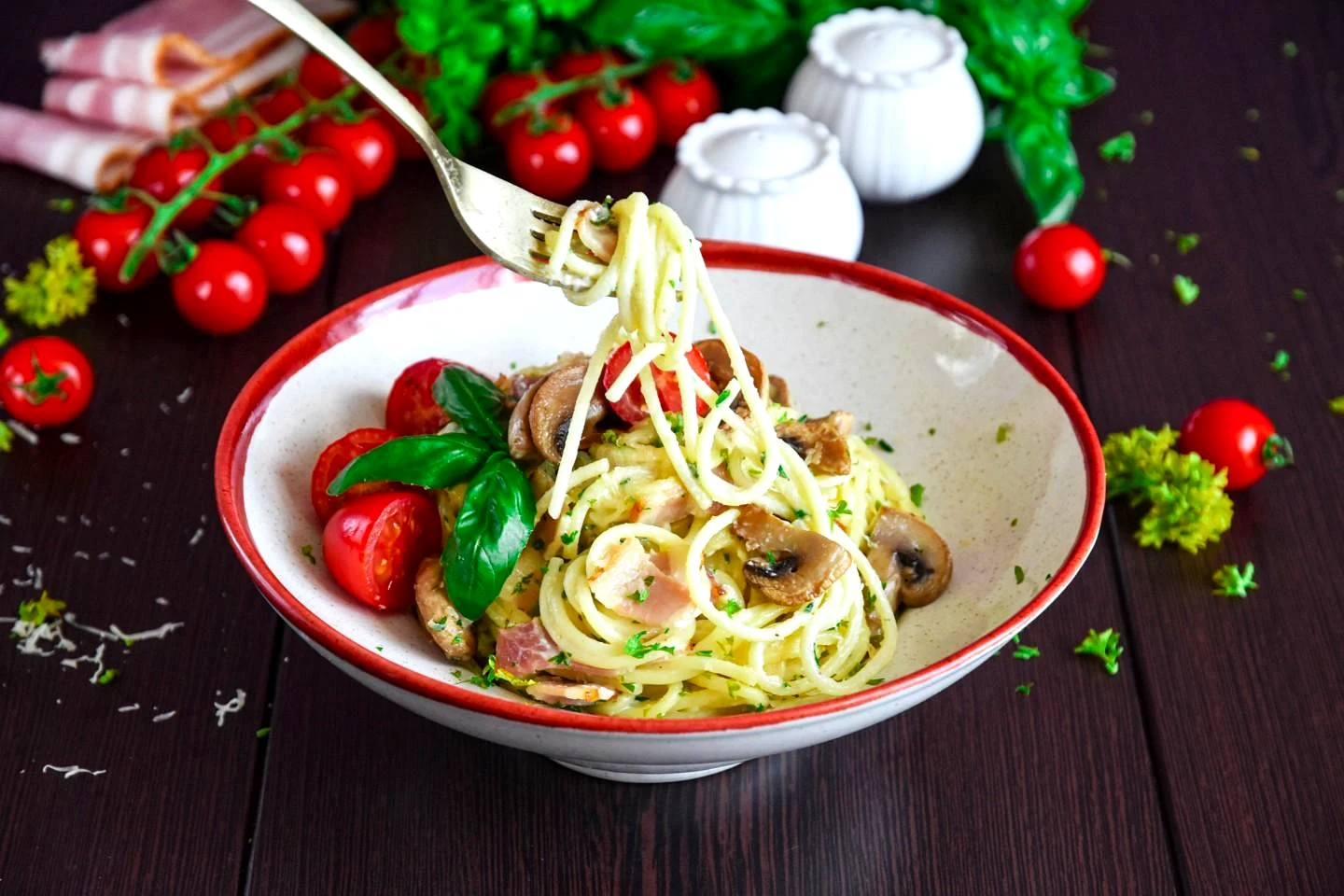 : Як зробити домашню пасту карбонару з грибами, беконом та вершками? Це досить просто. Спочатку підготуйте необхідні інгредієнти за списком. Спагетті можна замінити на феттучині або іншу довгу пасту. Вершки можна брати до меншої жирності - від 20%. Пармезан можна замінити на інші сухі або напівсухі сорти сиру. Якщо максимальна схожість з італійською пастою для вас необов'язкова, можете замінити пармезан на звичайний сир типу Російського.