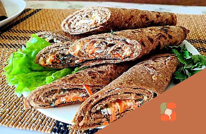 Печінкові млинці з начинкою з сиру, моркви по-корейськи та яєць.