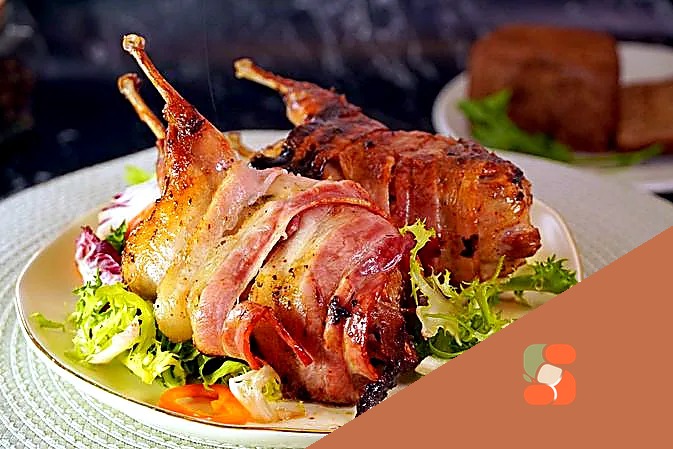 Обертаємо кожну перепілку скибочками бекону. За бажанням закріплюємо бекон кулінарною ниткою, щоб не розмотався.