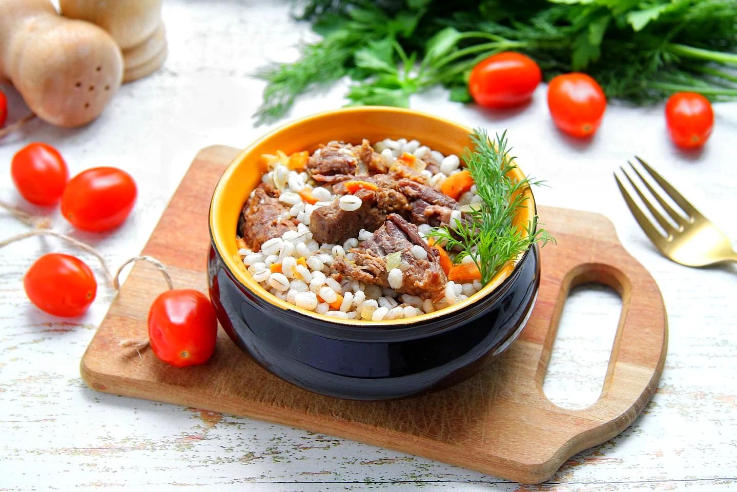 : Залейте перловку фильтрованной питьевой водой и оставьте минимум на час при комнатной температуре. Это позволит сократить в дальнейшем время варки крупы.