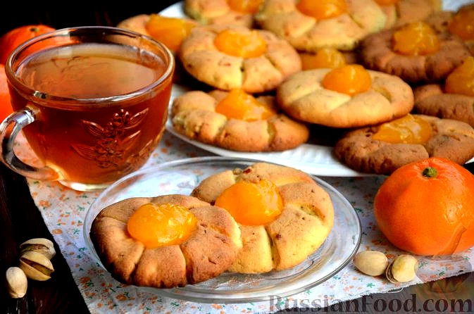 Пісочне печиво з фісташками, цедрою та мандариновою начинкою виходить у міру солодким, з яскравими вкрапленнями мандаринової цедри, горіховим ароматом та ніжною, вологою серединкою. Насолоджуйтесь!