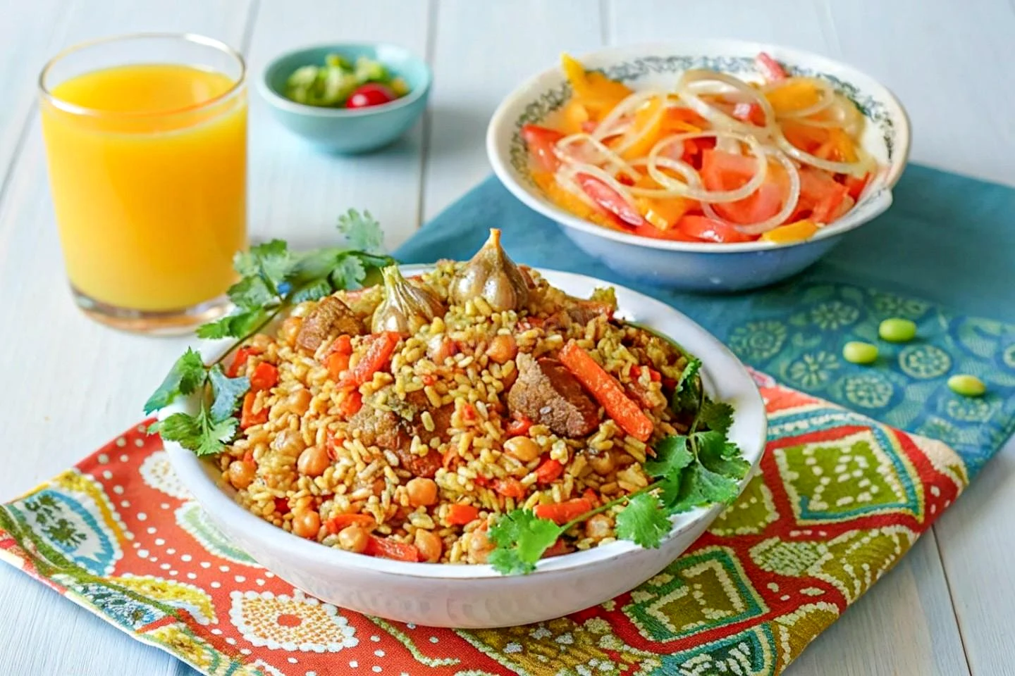 : Как сделать плов с нутом в казане? Подготовьте все ингредиенты. Предварительно замочите нут в тёплой воде не менее, чем на 6 часов (можно и на всю ночь). Слейте с него воду. Рис промойте в семи водах и оставьте в воде. Тщательно промойте мясо. Очистите репчатый лук от шелухи. Морковь вымойте и очистите от кожицы. Снимите один верхний слой шелухи с головок чеснока, оставляя их целыми, помойте.