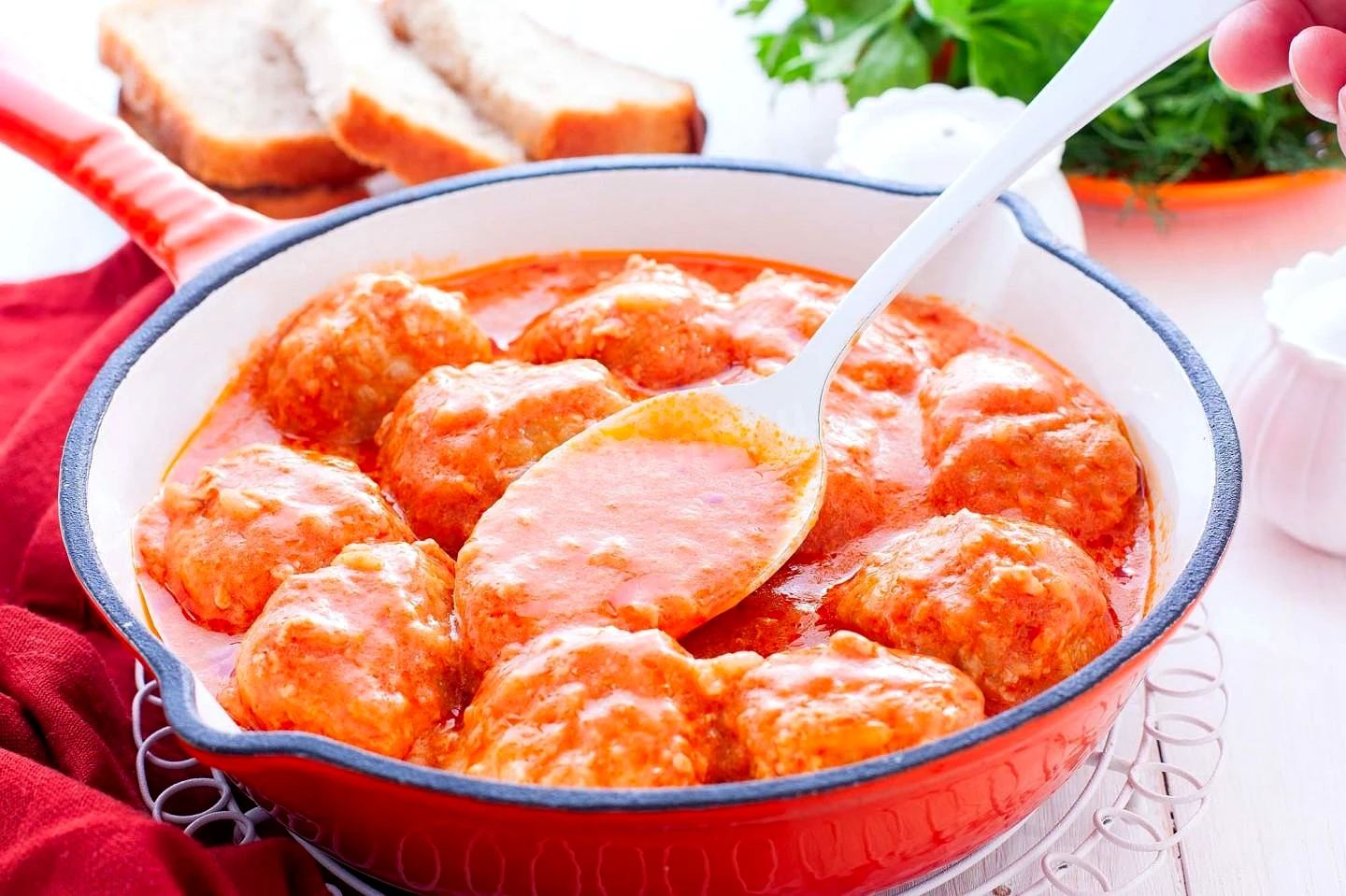: Готові тефтелі з томатною підливою розкладете по тарілках Цю страву можна подавати як самостійну або доповнивши її гарніром. Особливо добре воно поєднуватиметься з картоплею. Приємного апетиту!