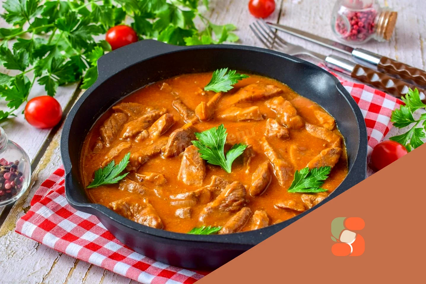 : Потім підлийте гарячу воду в сковороду. Додайте томатну пасту, лавровий лист, сіль та спеції. Накрийте кришкою сковороду і тушкуйте м'ясо хвилин 40. Тривалість гасіння залежатиме від м'яса. Спробуйте його. Воно має стати м'яким.