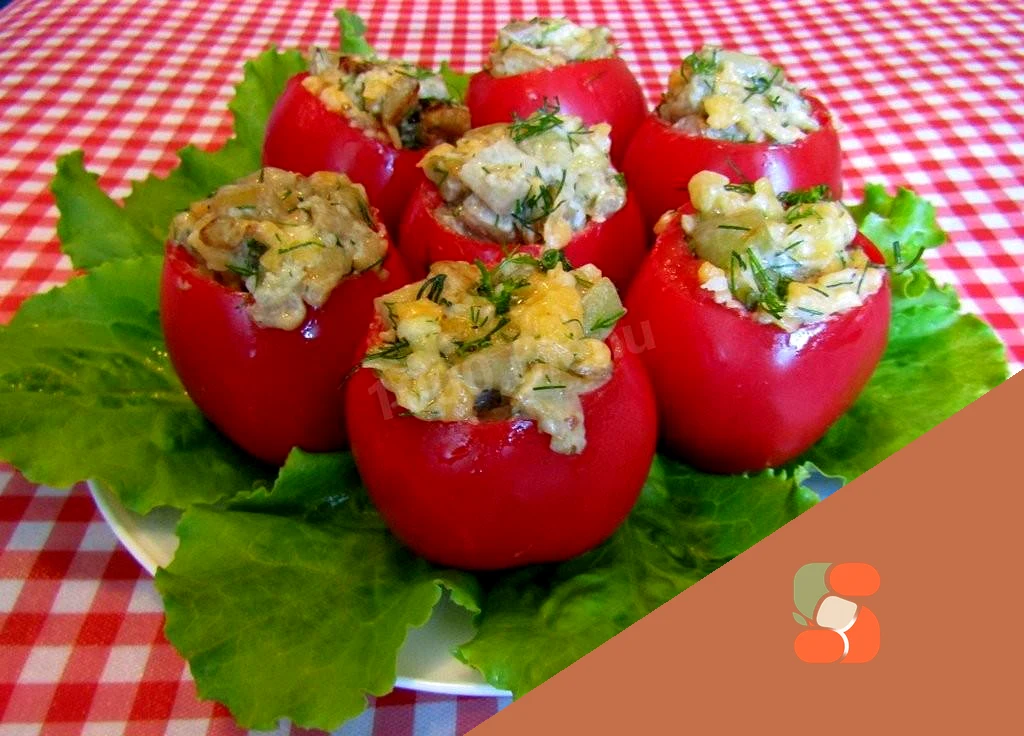 : Готовою начинкою начиняємо помідори і відразу поміщаємо їх на блюдо, на якому ми їх подаватимемо до столу. Прикрашаємо за бажанням, даємо настоятися протягом 20 хвилин і подаємо до столу.