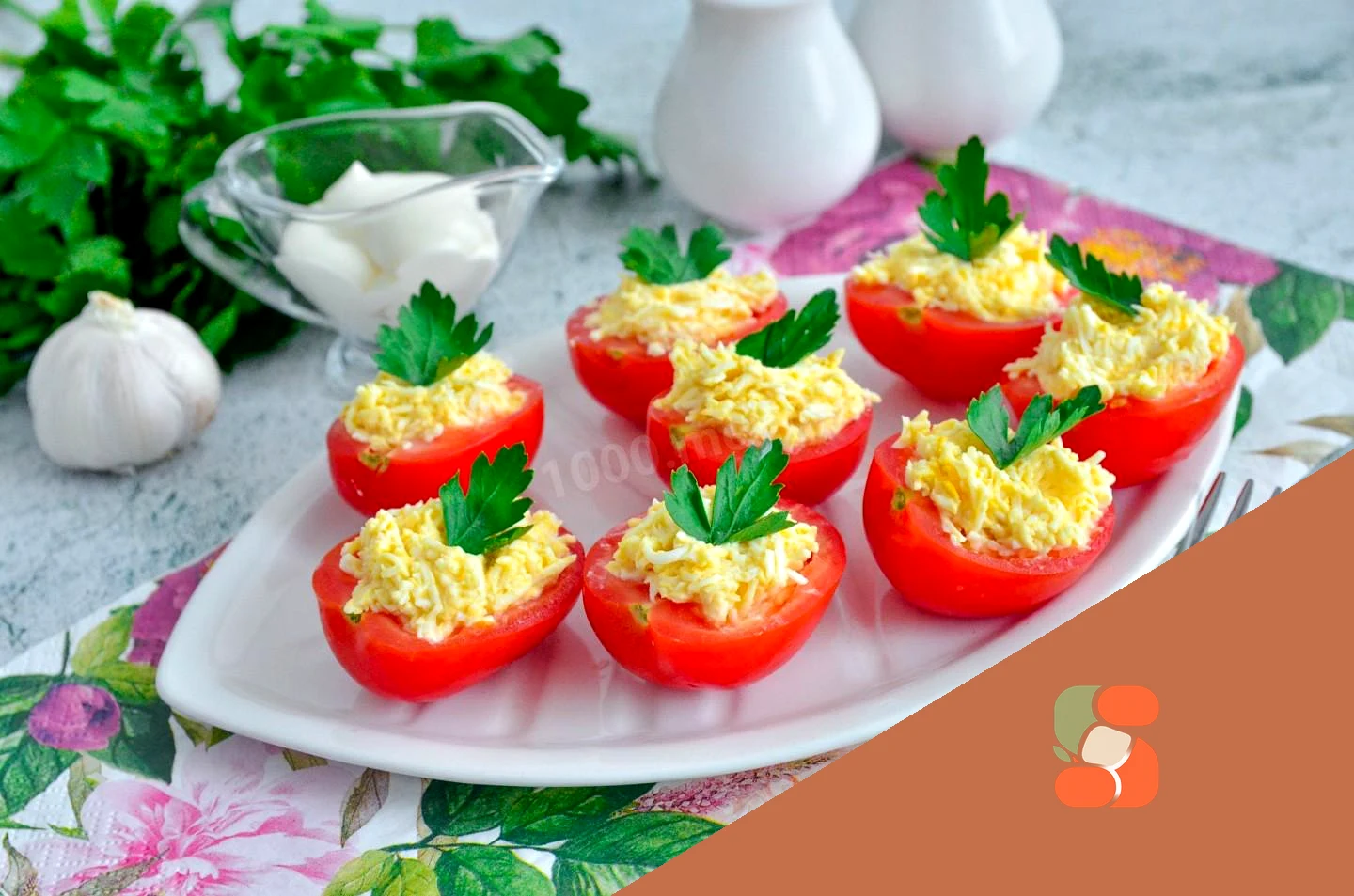 : Начиніть половинки помідор сумішшю, що вийшла, з сиру, яєць і часнику. Кладіть начинку ложкою, роблячи невелику гірку.