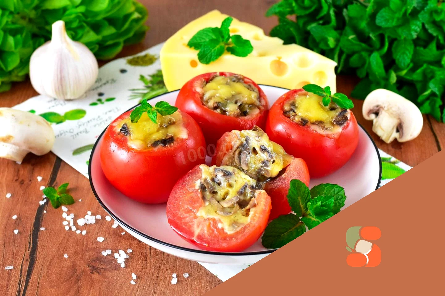 : Наповніть помідори підготовленою грибною начинкою. Зверху розподіліть тертий сир, що залишився. Перекладіть овочі в змащену олією форму для запікання і поставте в розігріту до 190 ° С духовку на 10-15 хвилин до розплавлення сиру. Точний час запікання залежить від вашої техніки та особистих уподобань.