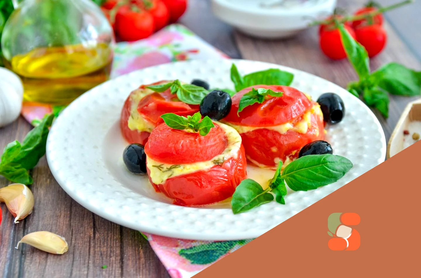 : Зріжте у помідорів круглу частину на денці, щоб вони могли стояти прямо і не падати Начиніть їх яєчно-сирною сумішшю. Накрийте кожен томат зрізаними кришечками.