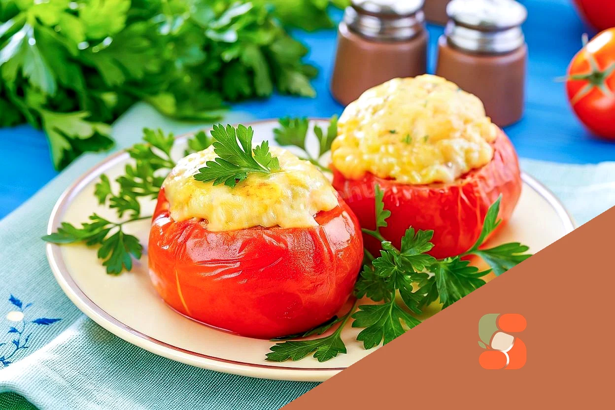 Як подати помідори до столу? Подавайте гарячі фаршировані помідори відразу з духовки, посипавши за бажання свіжою рубаною зеленню (петрушка, кріп, базилік). Вони гарні як самостійна закуска з скибочкою хліба, а також гарнір до м'яса або риби. Приємного апетиту!