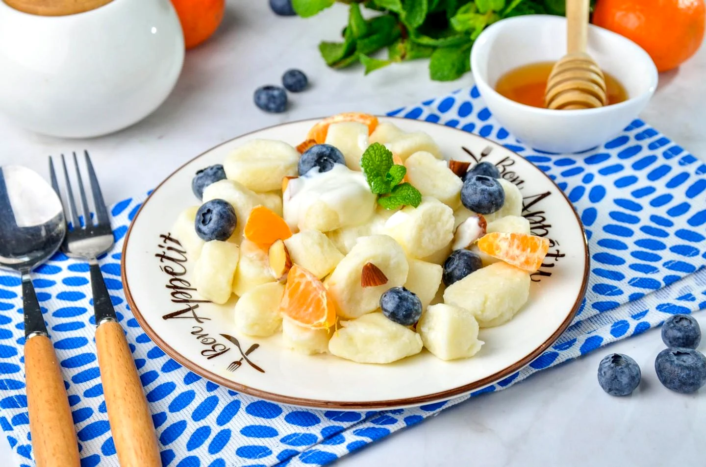 : Полийте вареники натуральним йогуртом та медом, можете додати свіжі ягоди, фрукти та горіхи. Подавайте блюдо до столу. Приємного апетиту!