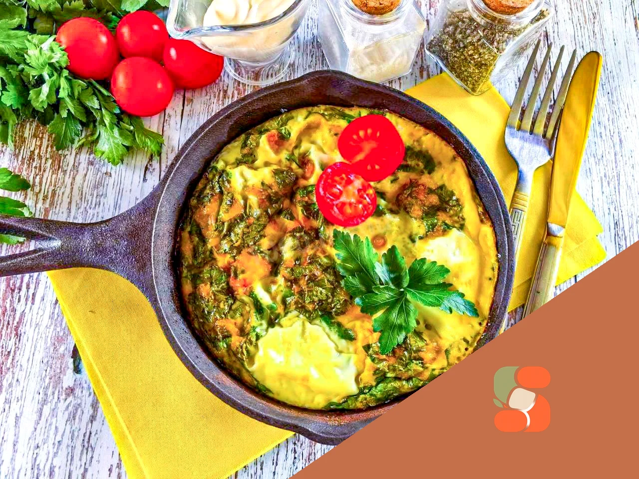 : Петрушку помийте, видаліть тверді стебла, дрібно наріжте Додайте петрушку до збитих яєць, посоліть і перемішайте.