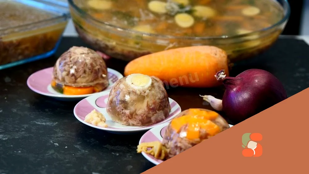 : Викладаємо в порційні форми досить щільно дрібно нарізане м'ясо, повністю заливаємо його бульйоном і прибираємо в прохолодне місце.