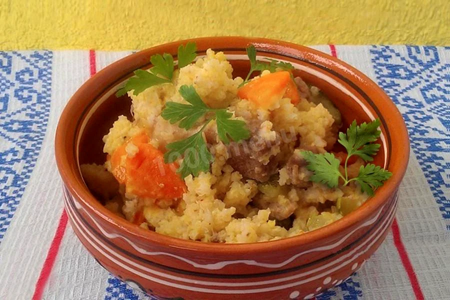Інгредієнти−6 порцій+Продукти (6 порцій)Просо200 грКурячий бульйон300 млСвинина800 грРослинна олія40 млЦибуля ріпчаста80 грЧасник10 грМорква80 грПаприка5 грВершкове масло|мастило|50 грПетрушка20 гр