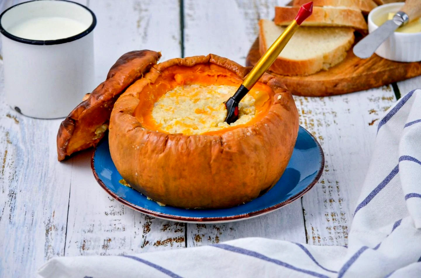 : Залейте пшено в тыкве молоком. Добавьте соль и сахар по вкусу. Вместо сахара можете использовать мед или сахарозаменитель, который не боится термической обработки.