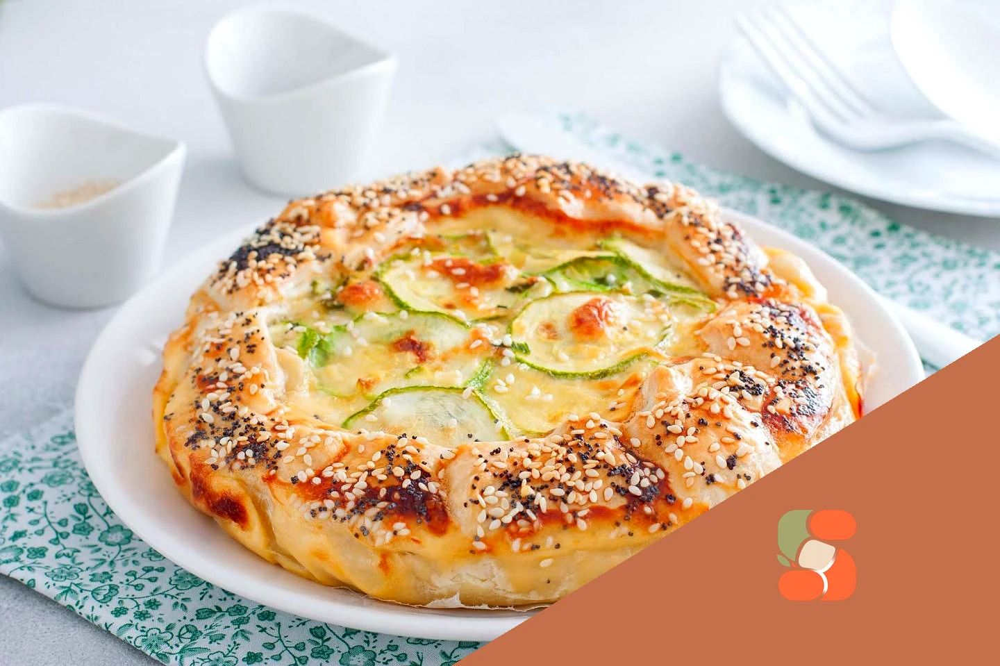 : Як зробити кабачковий пиріг? Підготуйте ці інгредієнти. Листкове тісто я беру готове бездрожжеве, можна тісто приготувати вдома самостійно. Якщо тісто заморожене, його слід попередньо розморозити. Кабачки візьміть молоді, щоб зберегти при нарізанні шкірку. Зелену цибулю за її відсутності можна замінити ріпчастою, але потрібно обсмажувати її до м'якості. Яйця взяла С1. Від кунжуту та маку можна відмовитися.