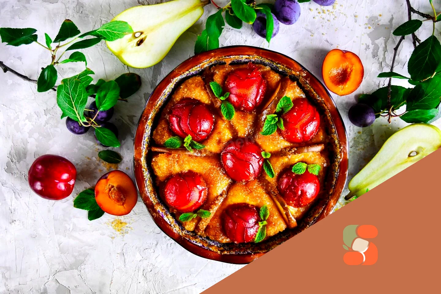 : Сливи вимийте, розріжте на половинки та видаліть кісточки. Сливи беріть стиглі, але щільні, щоб зберегти форму при випіканні. Грушу наріжте скибочками і видаліть кісточки.